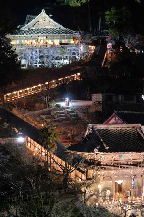 冬の境内は寒中に咲くボタンや南天、山茶花などに彩られ、大晦日からは登廊で観音万燈会が行われます。