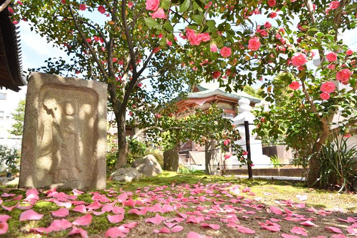 順慶の母は、若くして没した息子の菩提を弔うために香花が絶えない寺院の建立を発願し、それが伝香寺となりました。開創時にあった椿は代を継いで、現在3代目。奈良三名椿のひとつ「伝香寺散り椿」として親しまれています(他は東大寺糊こぼし椿、白毫寺五色椿)。