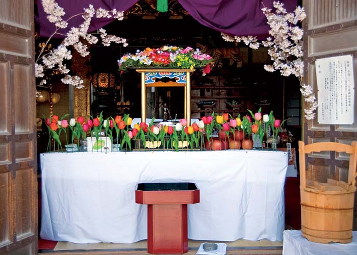 朝護孫子寺の灌仏会では、本堂前に花々で飾られた祭壇が設けられ、一般の参拝者も釈迦仏に甘茶をかけて参加することができます。