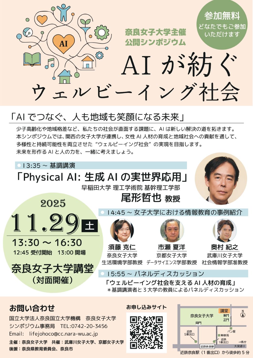 行事・イベント名 | 奈良女子大学主催公開シンポジウム「AIが紡ぐウェルビーイング社会」(奈良女子大学講堂) |
