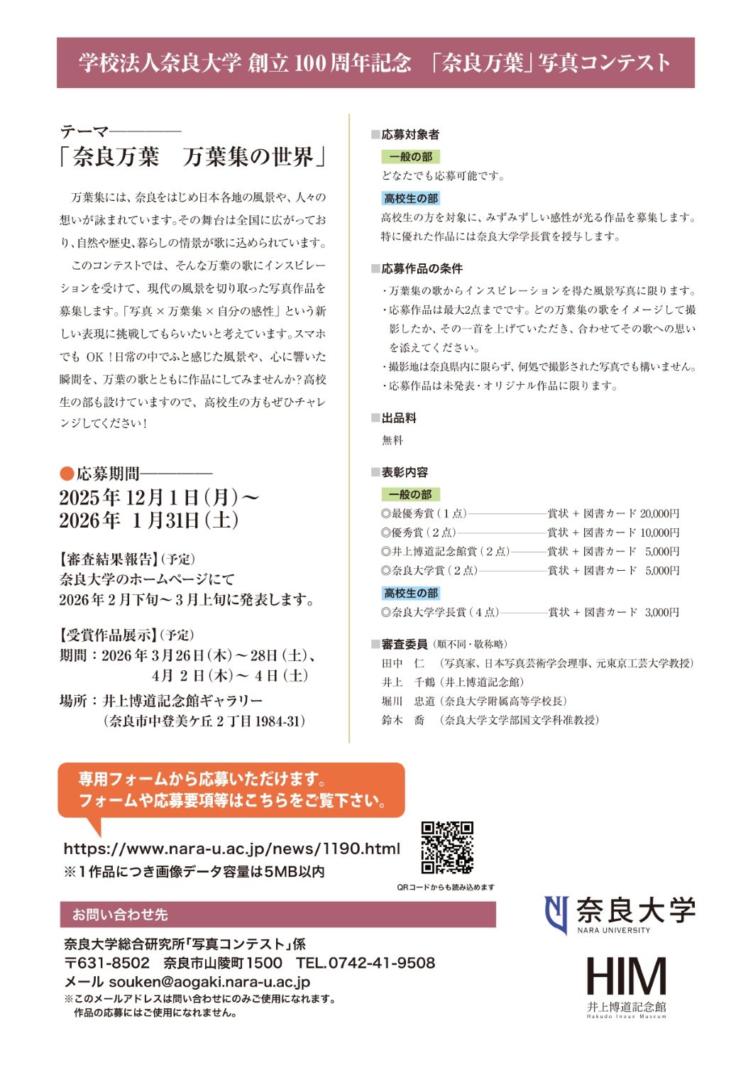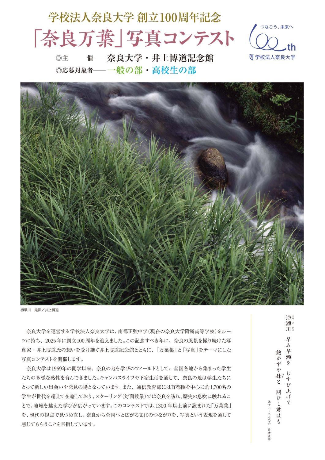 | 行事・イベント名 | 学校法人奈良大学創立100周年記念『「奈良万葉」写真コンテスト』作品募集 |