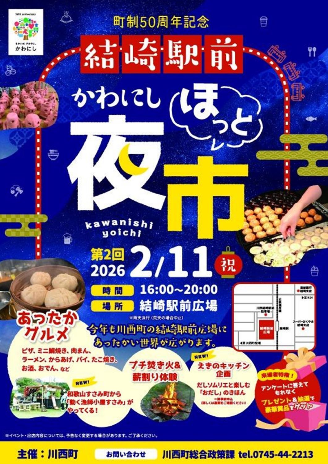 川西町の町制50周年記念!ことしも川西町の結崎駅前広場にあったかい夜市の世界が広がります。グルメやランタン企画であったまろう!