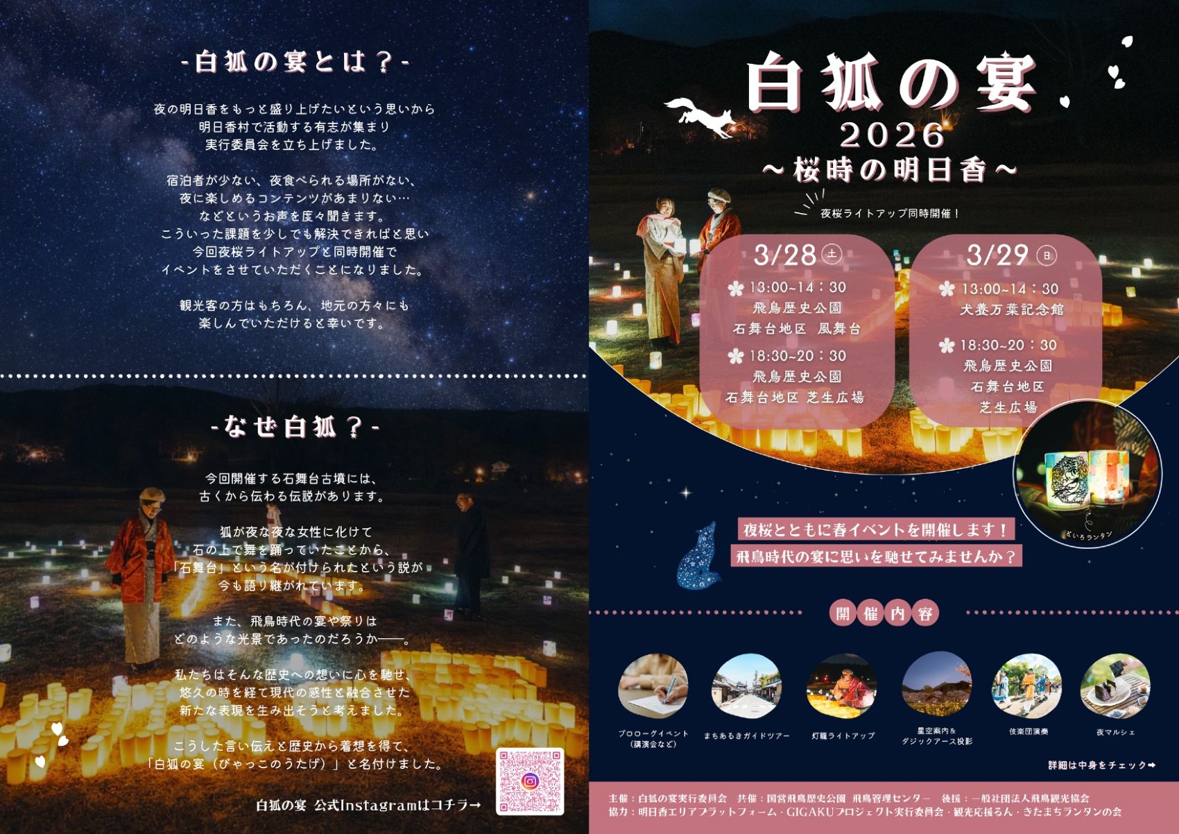 | 行事・イベント名 | 白狐の宴2026 ~桜時の明日香~(国営飛鳥歴史公園 石舞台地区/犬養万葉記念館※3月29日昼の部のみ) |