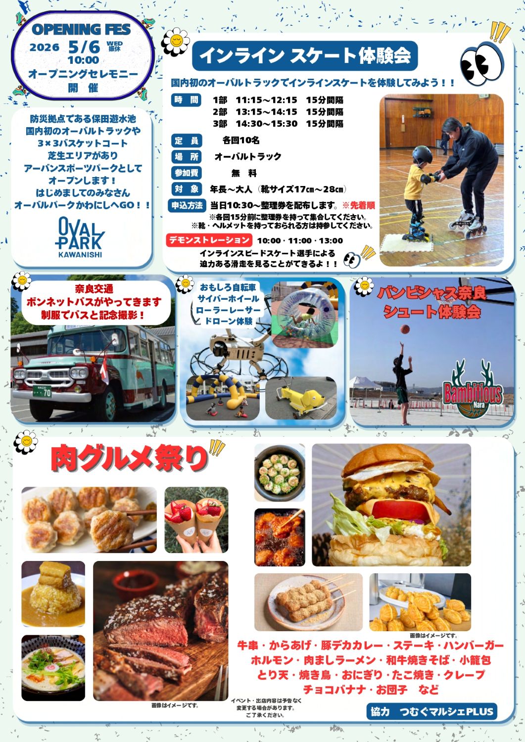 「肉グルメ祭り」(からあげ、ステーキ、ハンバーガー、和牛焼きそば、肉ましラーメンなど)、奈良交通の「ボンネットバス」展示、プロバスケットボールチームのバンビシャス奈良による「シュート体験会」、おもしろ自転車やローラーレーサーといったお子様向けの体験など、多彩なプログラムを予定しています。
