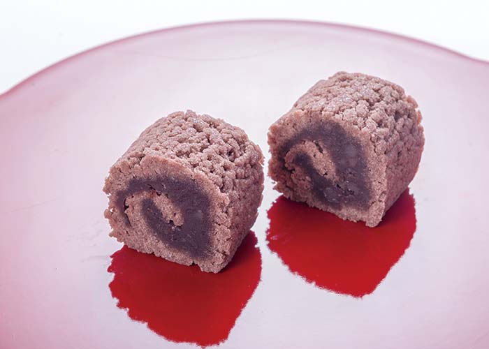 「良弁」:東大寺二月堂の良弁杉をイメージしたお菓子。村雨餡と大納言小豆の餡を巻き込んでいます。