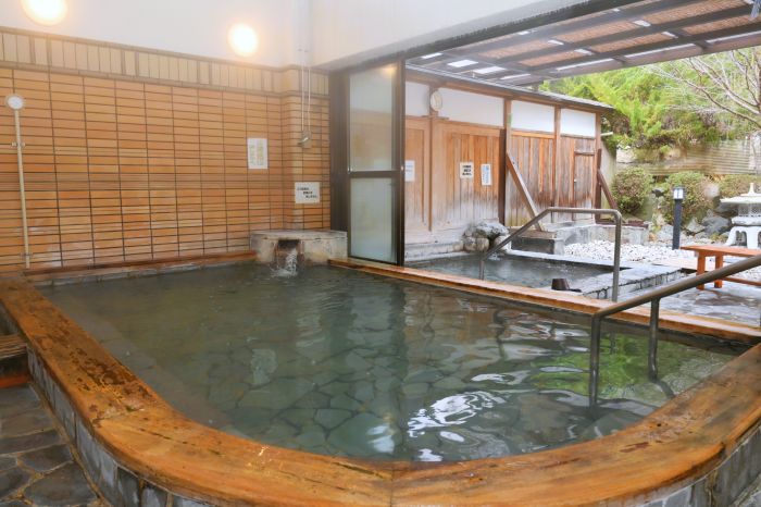 次は、露天風呂へ。やさしい湯がたっぷり。露天風呂の“庭”では、紅梅がちらちらと咲き、風流です。桜の木もあり、春には花見風呂が楽しめそうです。
