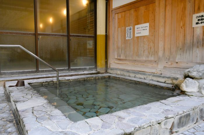 2026年2月6日、ごんたの湯。湯煙をくぐり、かかり湯をしてから、いちばん大きな浴槽につかって足を伸ばします。やや熱めに感じる湯(水温計は40℃)は無色透明。においもありません。