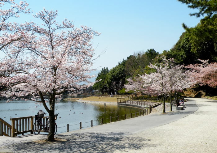 古代(推古天皇の時代とも言われます)からあるため池で、市民や水鳥たちがホッと落ち着ける、癒しの水辺です。桜は点々と、しかし池をぐるりと囲むように咲きます。遊歩道を歩くなどして、春の陽射しを満喫できます。