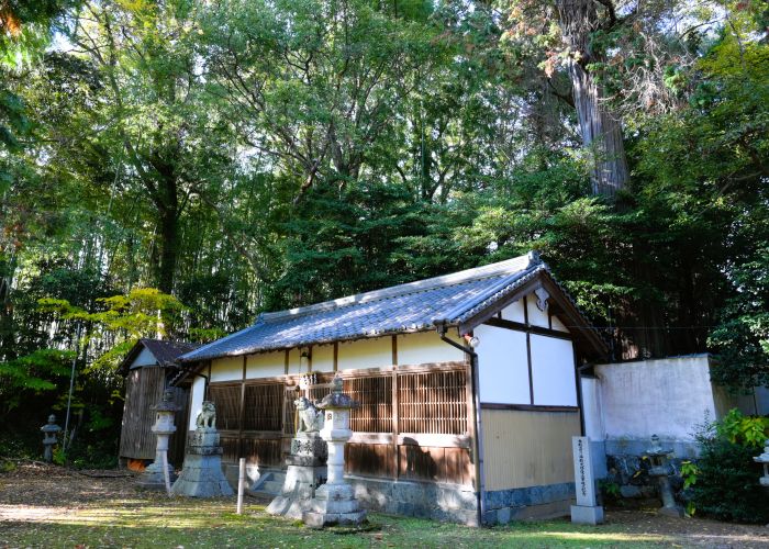 鳥居をくぐり、石段を上がった社地に、切妻造瓦葺の拝殿が、樹高の高い木々に守られて建っています。拝殿の奥に東殿・西殿があり、それぞれ伊波俄加利命(いはかがりのみこと)、大彦命(おおひこのみこと)がご祭神。『延喜式神名帳』にその名が記された式内社です。