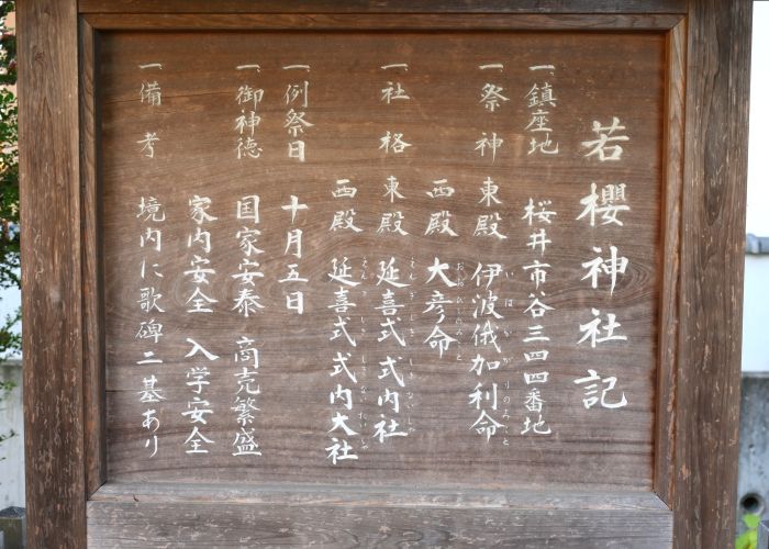 近鉄・JR桜井駅から南進約550m、左右を桜の木に挟まれた、若桜神社の石鳥居が見えてきます。