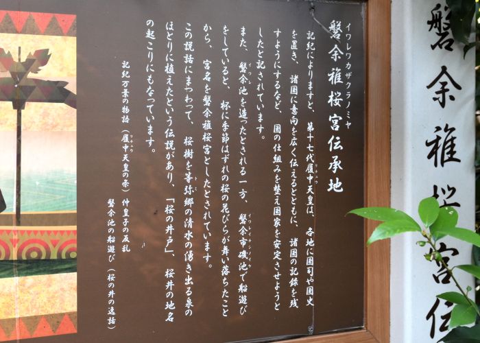 仁徳天皇の次に即位した第17代天皇とされる履中天皇が皇后らとともに磐余市磯池(いわれいちしのいけ)で船を浮かべて遊宴していると、盃に桜の花びらが舞い落ちてきました。偶然の幸運を喜んだ履中天皇は桜にちなんで、自身が造営した宮の名を磐余稚桜宮(いわれわかざくらのみや)とした、ということです。