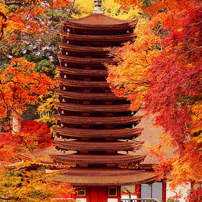 藤原の祖・中臣鎌足を祭神とする神社。鎌足と中大兄皇子が大化の改新の計画を語り合ったとされることから「談い山(かたらいやま)」と名づけられたといいます。なんといっても、十三重塔と紅葉の競演にうっとりさせられます。